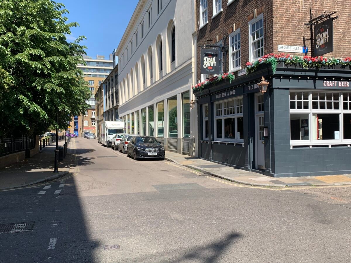The final location used in this area was Lafone Street. On the corner of Lafone Street, you’ll find The Dean Swift pub. Again, this was quite a tough location to find, thanks to all the streets looking exactly the same, but I believe that in the television episode, when the Army captain goes to use a telephone booth to call for reinforcements, that booth is just in front of what is now the pub. The buildings on the left-hand side of the screen in those scenes are now gone and I think it’s a small park. It’s the building at the end of the street that I used to find where these scenes had been shot: each door and window up the middle is painted TARDIS blue, and it just looks like it’s had a paint job since 1983.